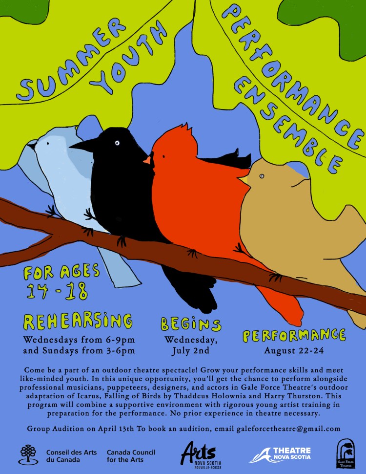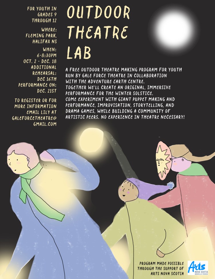 Check out our program trailer from our Fall 2023 Outdoor Theatre LAB and Adventures in Outdoor Theatre! Throughout our weekly sessions we created an original performance with music, song, stories and magic that our teen and pre-teen participants performed on the Winter Solstice. Thank you to Kurtis McAllister for creating this video and to Arts Nova Scotia and the Adventure Earth Centre for making this program possible.